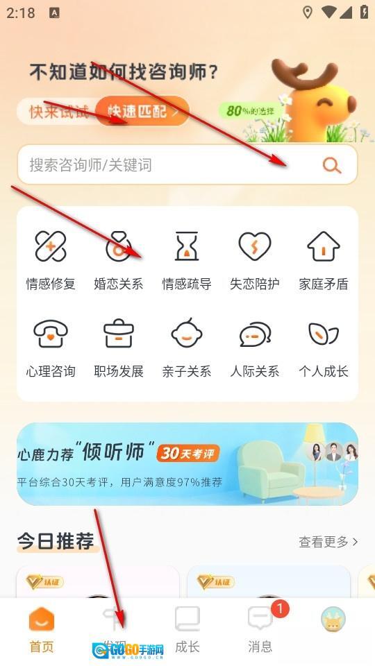 打开软件进入首页后,我们既可以选择快速匹配合适的咨询师,也能通过搜索功能,或者依据自身情况去寻找不同分类下专属的心理咨询师。