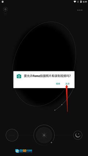 打开fomz复古胶片相机应用,在弹出的权限请求中点击允许拍摄照片和录制视频,即可开始进行拍摄操作。