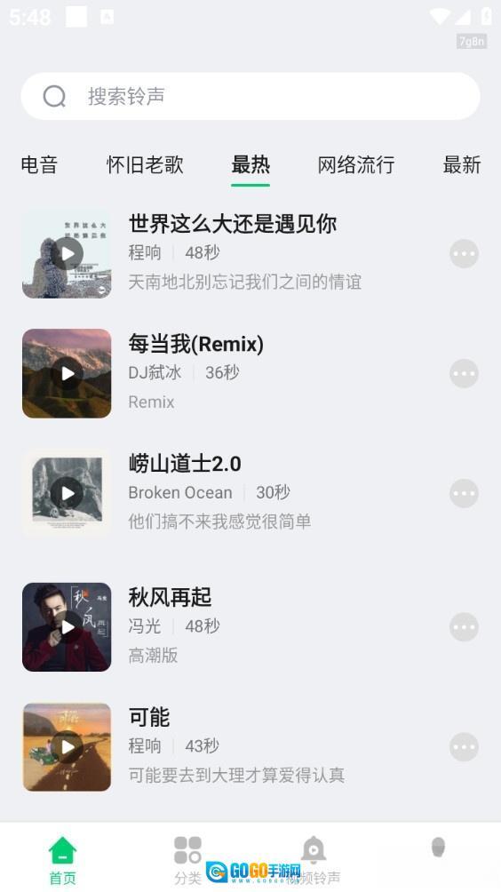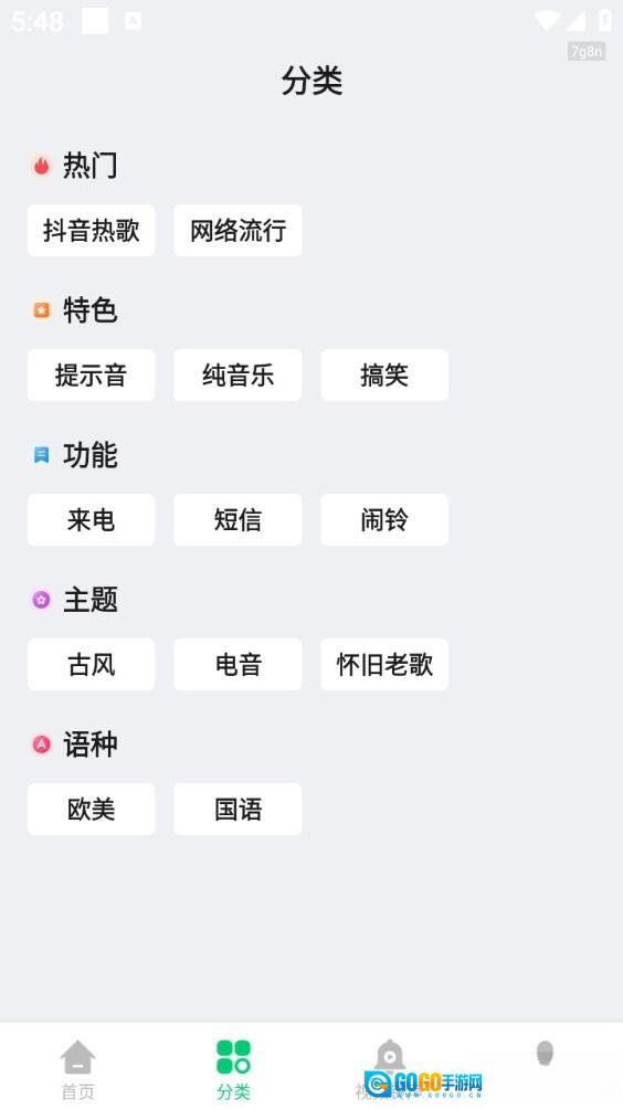 【铃声分类】软件内的铃声资源分类清晰明确,能让用户更便捷地查找所需铃声。
