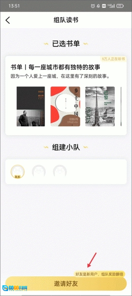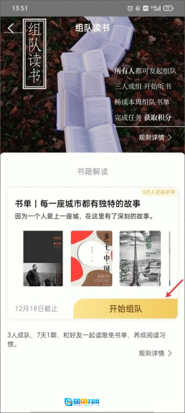 2、页面上会展示你需要阅读的书单,3个人组成一组,点击“开始组队”按钮即可。