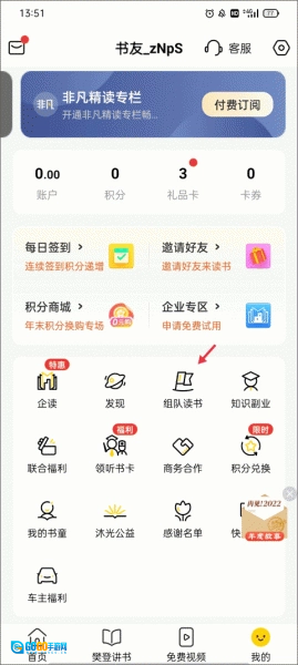 1、打开应用进入【首页】,随后切换至【我的】界面,这里陈列着企读、发现、组队读书、知识副业、联合福利等多种功能选项,从中选择“组队读书”即可。