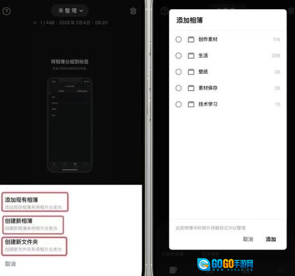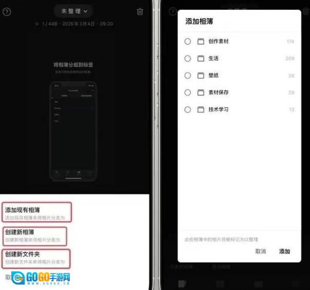 在归档时,会智能推荐已创建的相册名称(如“家庭”、“自拍”),也支持一键创建新相册,实现快速批量分类。