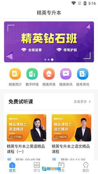 1、首先在手机上打开精英专升本,就像下面的图所展示的那样,里面包含了精英简介、教学环境、精英师资等内容。