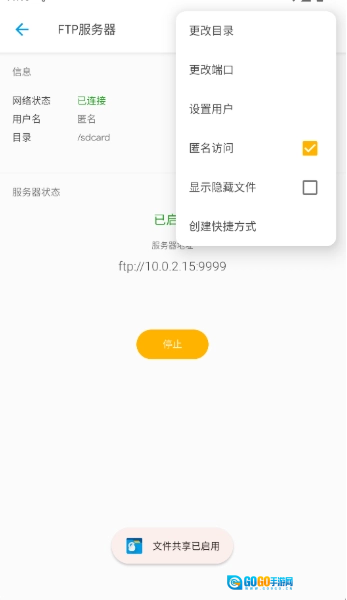 3、点击“开始”按钮即可启用局域网服务器,若需终止服务,随时点击“停止”按钮即可。