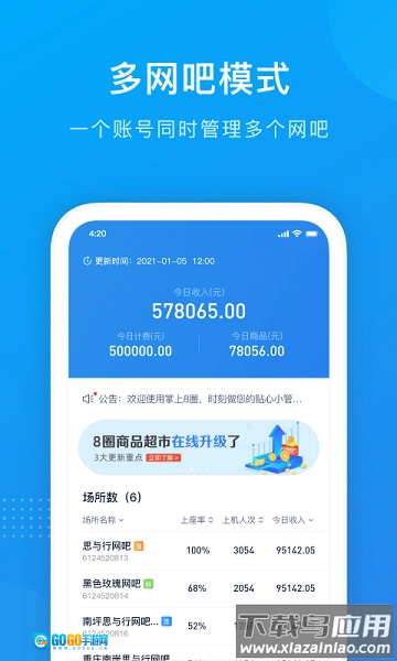 掌上8圈是专门为网吧经营管理人员打造的移动管理工具,能为老板、网管等不同角色提供便捷的管理支持。借助这个应用,用户可以实时了解所有设备的运行情况,清晰查看营业收入数据,便于随时随地开展业务监控和操作。