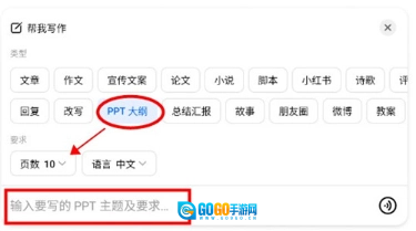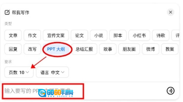2、选择并点击“PPT大纲”,设定PPT的页数和输出语言,并在下方输入框中,输入对于PPT的主题和其他要求即可。