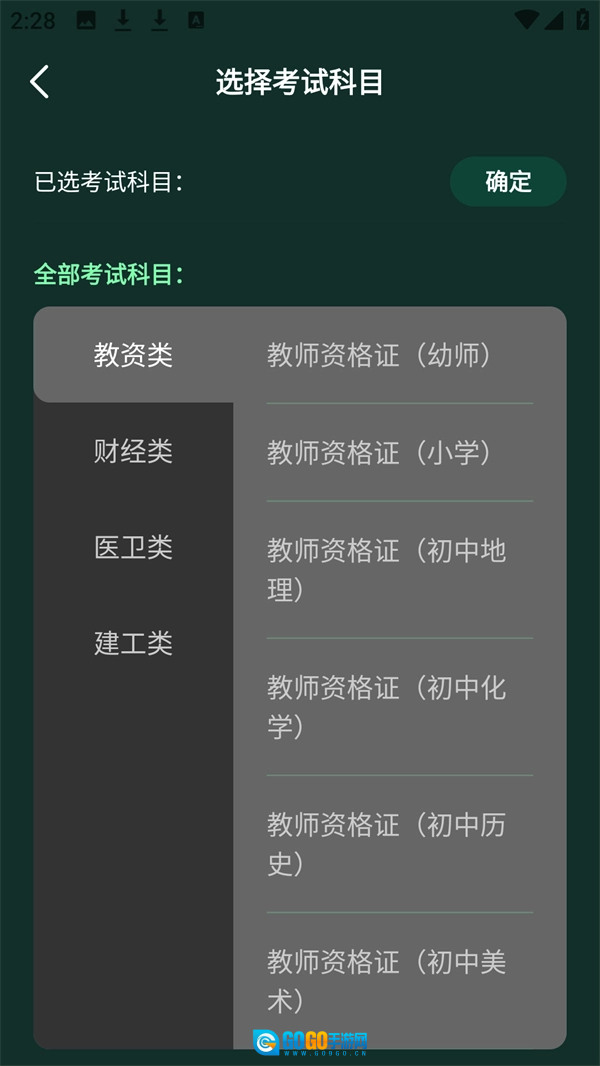 软件专注于教资、财经、医卫、建工四大领域的职业资格考试,正如截图所呈现的,单是教师资格证就细化到“初中历史”“初中化学”等具体学科。这种垂直化的设计让题库内容更为精准,能够满足用户从选择科目到精细化备考的全流程需求。
