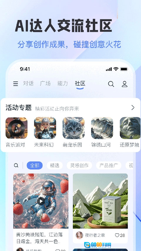软件内设有“社区”板块,用户能够在“灵感创作”“产品推广”等分类中,发布和浏览AI生成的图文作品(例如“夜行者之歌”),还可以参与“音乐派对”之类的专题活动。由此构建起一个围绕AI创作展开交流互动的社区。