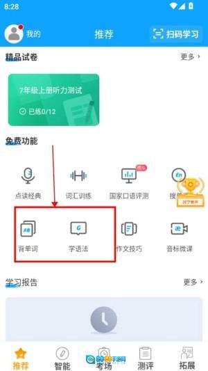 1、打开外语通初中版并完成账号注册,进入主界面后,可选择单词学习或语法练习模块来开启每日的学习训练。