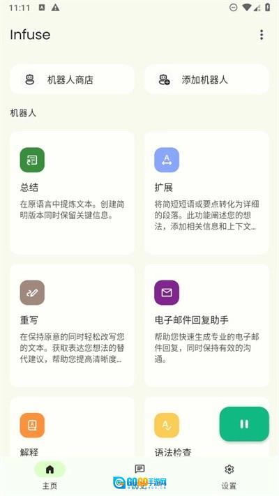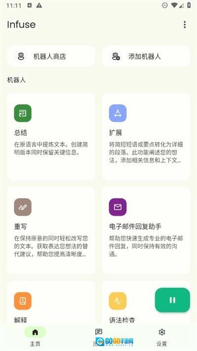 应用的核心在于提供一系列功能清晰的AI“机器人”。每个机器人都专注于一项特定任务,比如“翻译”机器人专门负责语言转换,“总结”机器人用于提取关键信息,“扩展”和“重写”机器人则分别承担内容充实与表达优化的职责。这样的设计使得用户可以“按需选择”,不需要使用复杂的指令。