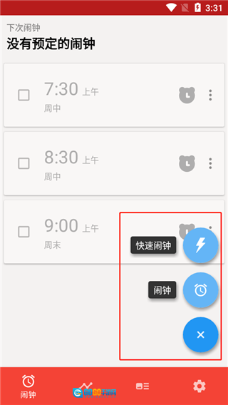 3、点击右下角的+号,即可设置快速闹钟与普通闹钟这两种类型。