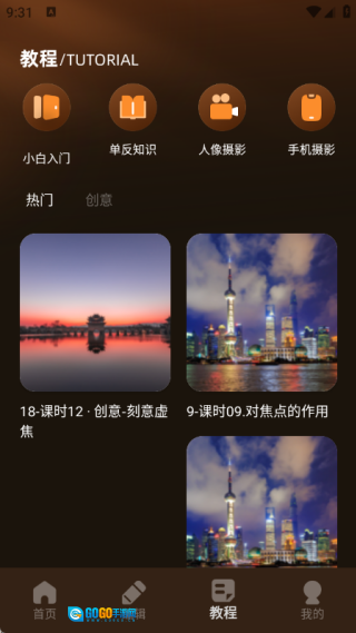 4、通过教程,你可以学习到新手入门技巧、单反相机知识、人像摄影方法以及手机摄影技巧等内容。
