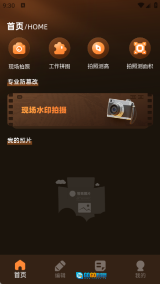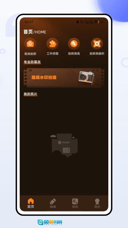 首页配备了现场拍照、工作拼图、拍照测高、拍照测面积等实用功能,同时支持现场水印拍摄。