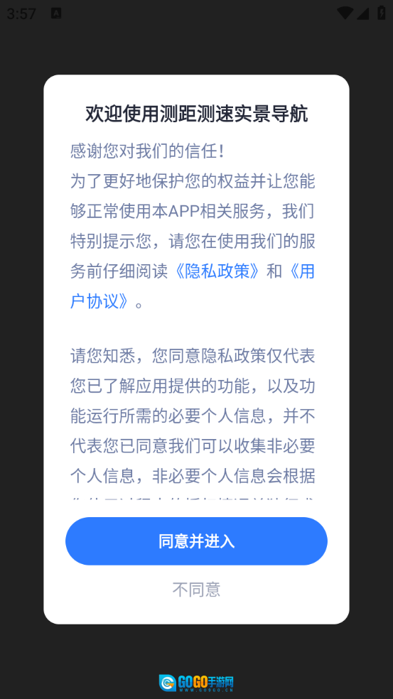 1、首先在3G游戏网安装测距测速实景导航应用,安装过程中需同意相关隐私政策和用户协议。