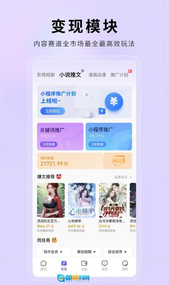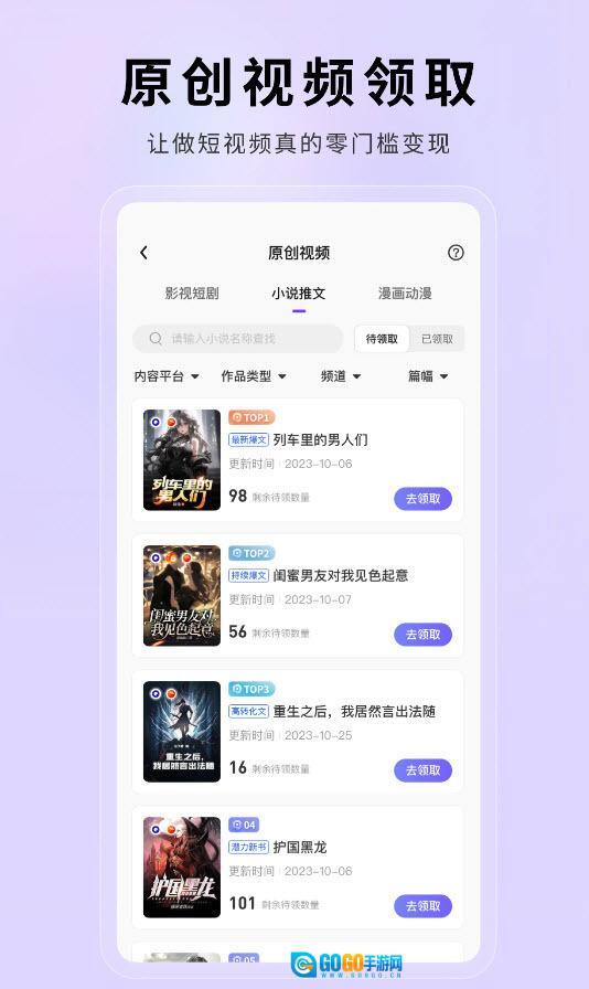 3、优质视频领取——精选市场热门变现视频模型与原创优质内容,领取后即可参与相关任务发布,让创作与变现过程更简单高效