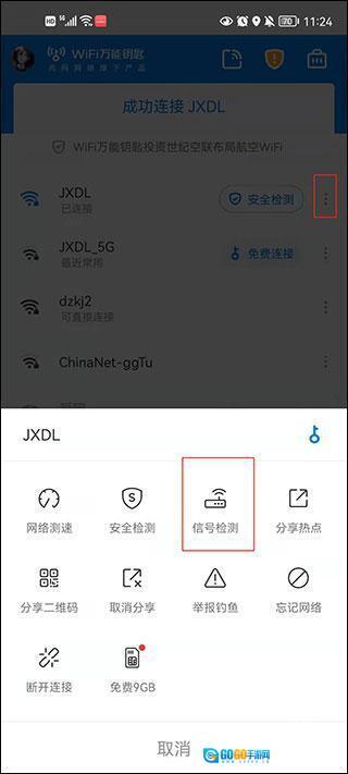 1、找到当前连接的WiFi热点,点击其右侧的三个点图标,之后就能对该WiFi进行信号检测了。