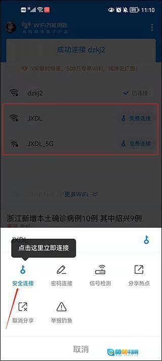 2、从例图中可以看到,名称后面带有钥匙图标的就是支持自动连接的热点,我们只需点击“安全连接”按钮,就能自动完成WiFi的连接操作了。