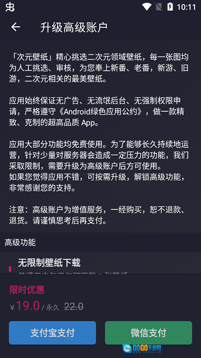 软件还提供哔哩哔哩大会员联动服务与定制手机壳服务,升级高级账户的入口可在设置中找到,而通过发现页面和分类页面,则能持续获取新鲜壁纸。