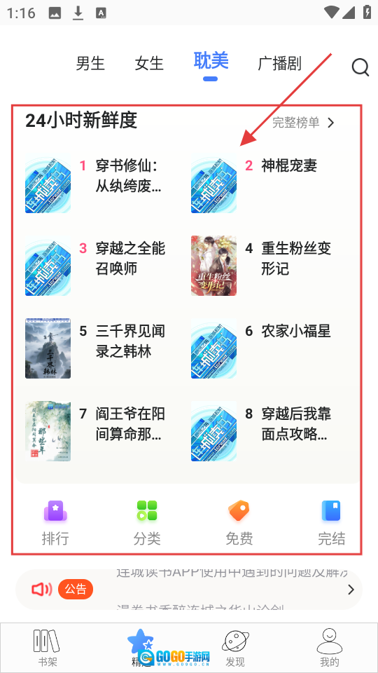 在精选页面选择【耽美】分类,找到你感兴趣的小说(例如【神棍宠妻】),点击进入查看详情。