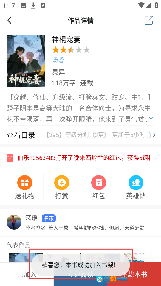 加入书架后系统会给出提示,这就意味着你已经成功收藏了这本小说,操作起来是不是很简单呀。