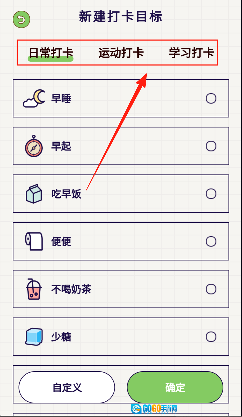 好习惯打卡为我们提供了多样的类别选项,像跑步、早起、吃水果等等,而且它还支持自定义功能呢。