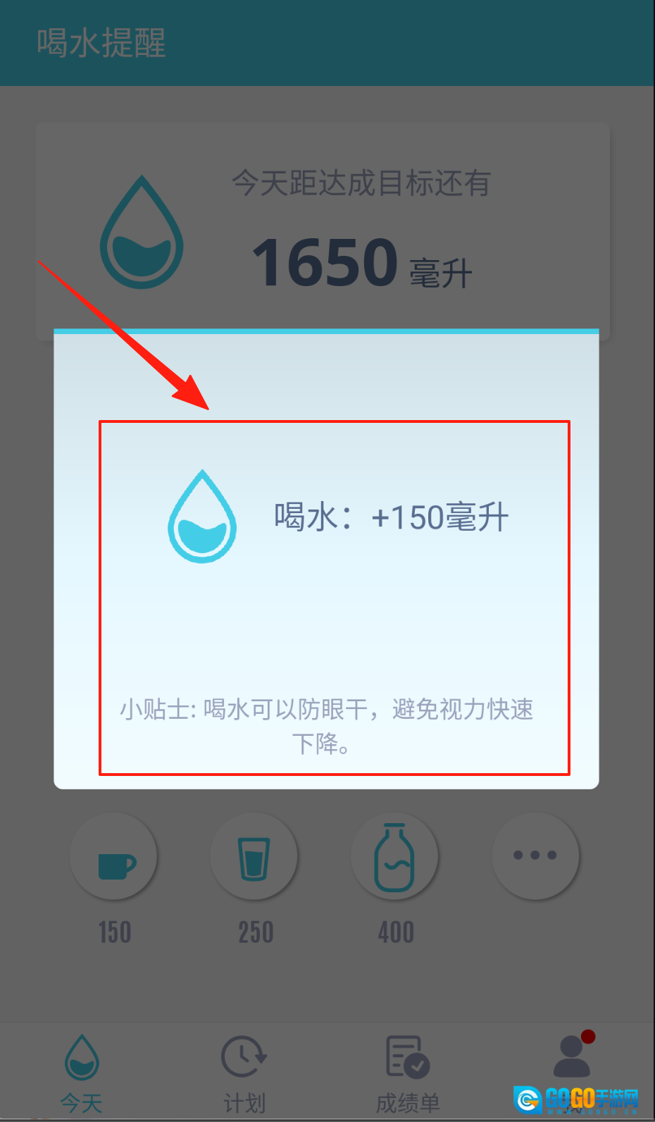 每次喝水时别忘记点击打卡记录水量哦,软件会自动减去剩余的目标量,你还能看到今日的完成进度条,要是没喝够的话,会有温柔的提醒呢。