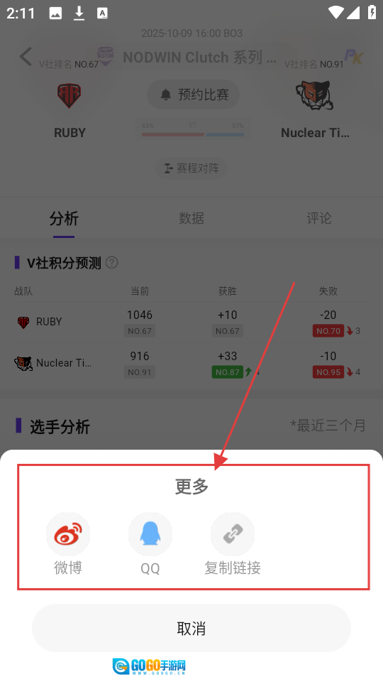 要是打算分享比赛,点击【分享】按钮后,会出现【更多】选项,从中可以选择【微博】【QQ】或者【复制链接】,操作起来特别方便。