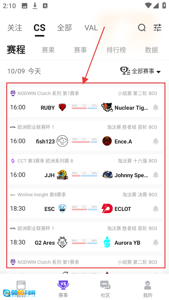 切换到赛事页面后,在【赛程】板块可以查看当天的所有比赛安排,包括各战队的对战时间,便于提前做好观赛规划。