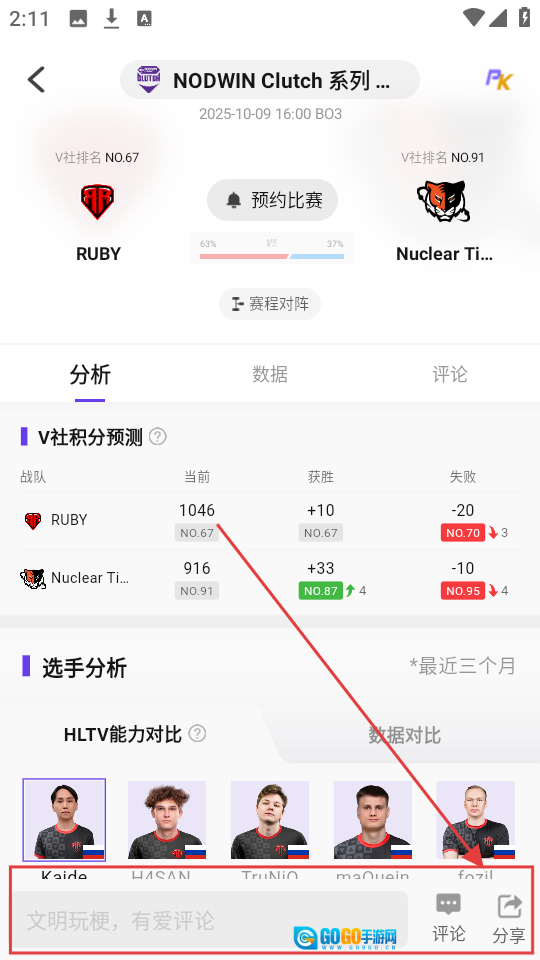 进入具体比赛页面后,可查看战队积分、选手等分析内容,浏览完毕还能点击【评论】按钮,与其他玩家交流各自的看法。