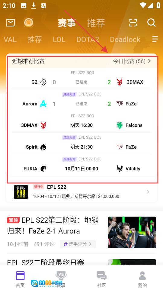 进入首页后,你会看到【近期推荐比赛】和【今日比赛-(56)】这两个板块,不妨先从这里入手了解当下的热门赛事,挑选自己感兴趣的内容看看吧。
