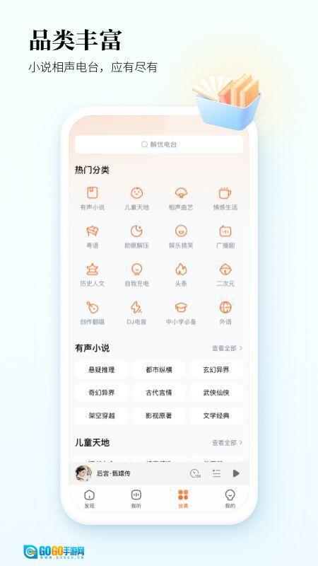 这个平台的内容十分丰富,除了听书之外,你还能在“分类”板块找到“助眠解压”“自我充电”“娱乐段子”等多种类型的音频,这些内容能够满足你在不同场景下的多样化需求。