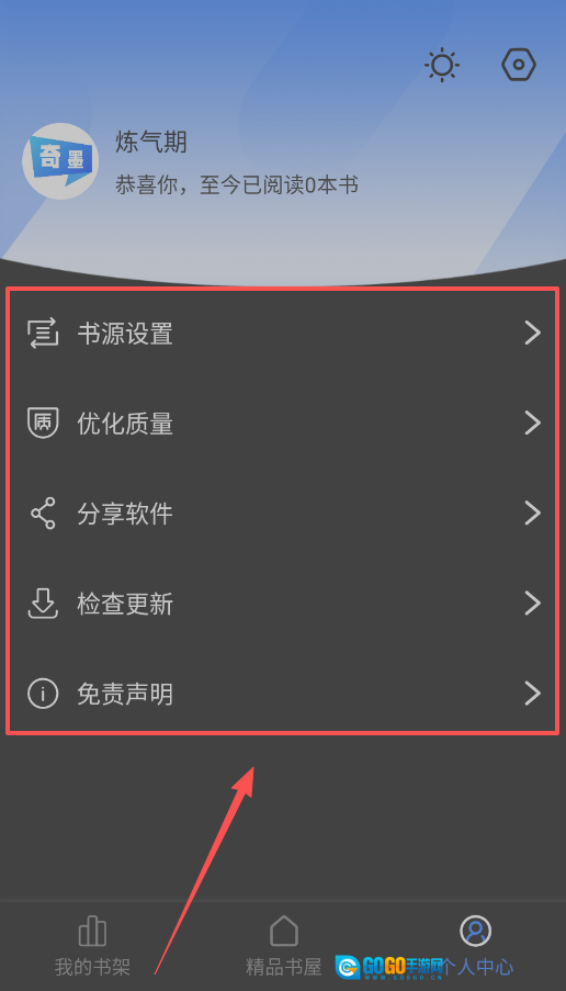 启动软件后,主页会呈现你的阅读等级与进度。建议先进入书源设置完成优化,并熟悉分享、更新等辅助功能,以便让阅读体验更流畅。