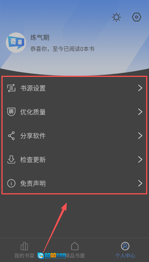 首先要做的是熟悉主界面。顶部区域显示着你的阅读等级和进度情况,在它的下方能找到书源设置的入口,这里建议大家优先进行优化调整。