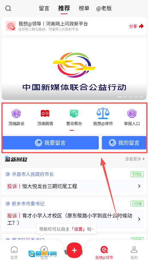 若您有诉求需要反映,可点击“我想@领导”板块,选择“我要留言”提交问题,后续可在“最新回复”中查看办理进度。