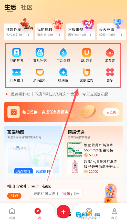 进入生活社区后,你会发现这里整合了外卖、福利社、辩论赛等日常服务,还能顺便完成每日签到任务。