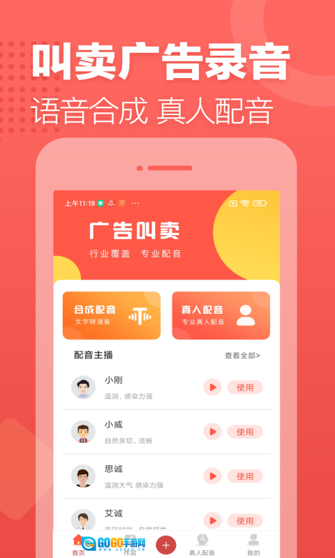 覆盖超12类使用场景,涵盖地摊叫卖、校园广播、影视配音等,适配商业推广与个人创作需求。