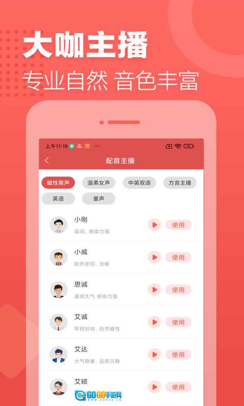 采用百度与云知声双平台的语音合成技术,可呈现自然流畅的电台级配音效果,并且支持童声、方言等多种音色的切换。