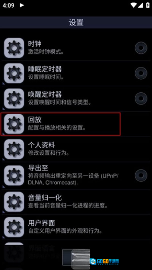 2、在设置页面里,找到"回放"选项并点进去。