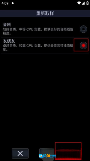 4、在重新取样的选项里选择"发烧友音质",然后点击右上角的√确认保存就搞定啦。