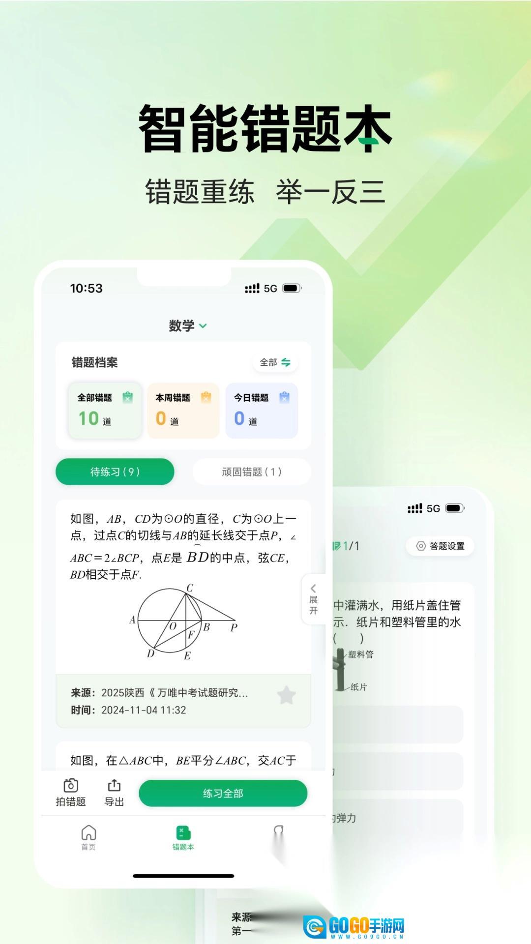 同考点变式题智能推送, 针对错题考查知识点推送符合考情的变式题,举一反三;错题反复练,支持线上练习、免费导出个人专属错题集,打印练习