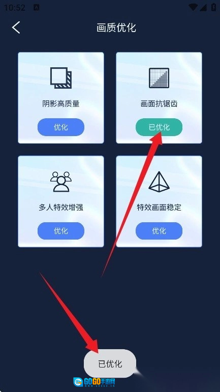 4. 确认设置内容后,点击【优化】按钮,即可启动优化流程,完成后下方将自动显示“已优化”状态提示,表明当前配置已生效。