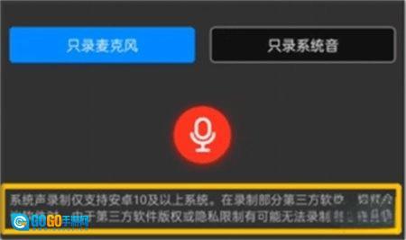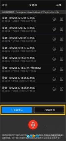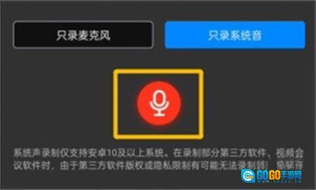 3、可以选择【只录麦克风】或【只录系统音】。其中,【系统声音录制】功能仅支持安卓10及以上系统。在录制部分第三方软件,如视频会议软件时,由于第三方软件的版权或隐私限制,可能无法录制到声音。