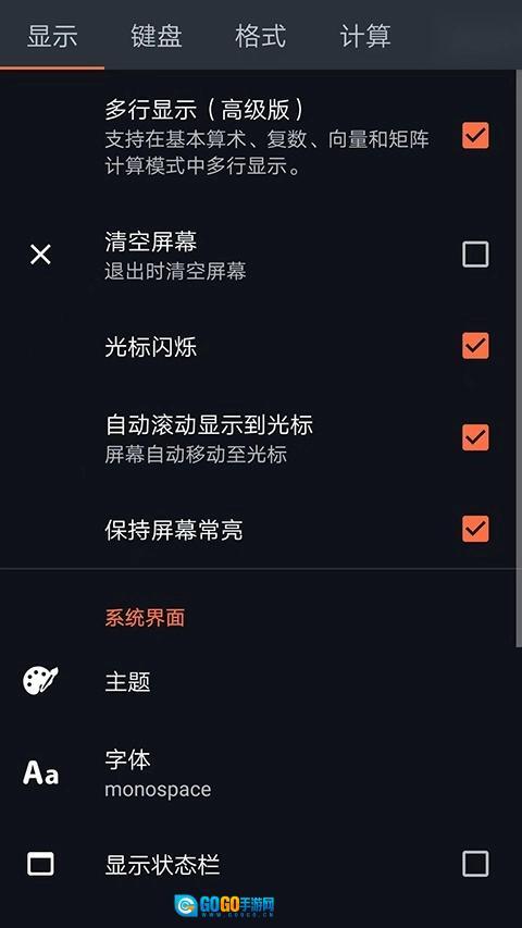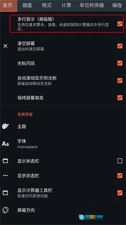 2、接着,在设置页面的【显示】选项中,勾选【多行显示】。这个模式支持在基本算术、复数、向量和矩阵计算模式中进行多行显示。