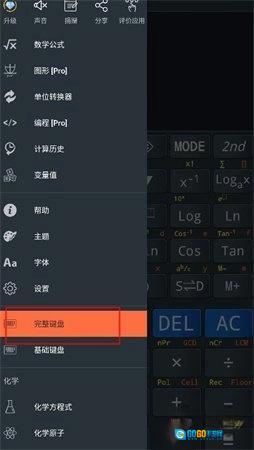 1、首先,打开应用程序后,点击左上角的菜单按钮,选择【完整键盘】选项,计算器便会直接切换为科学计算器模式。