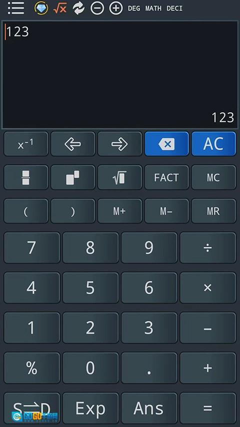 3、返回主界面后,你的手机就正式变成一个科学计算器了,各种操作都和实体计算器一样。计算后,如果想要将结果显示为简化表达式(包括分数、平方根、π等符号的精确结果,例如将0.5转化为1/2),请按[SD]键。