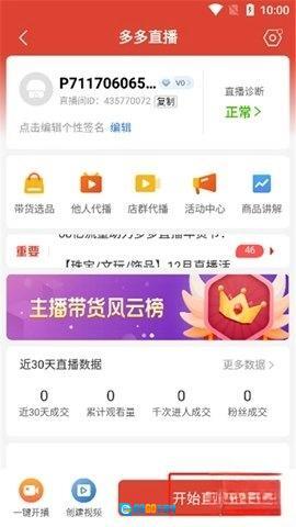 2、多多直播提供了带货选品、他人代播、店群代播、活动中心和商品讲解等功能,点击“开始直播”;