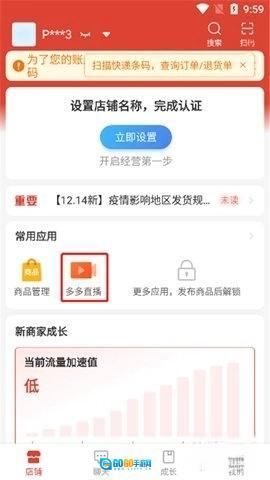 1、进入软件首页,在店铺界面的常见应用中选择“多多直播”;