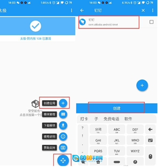 打开Xposed框架,选择“创建应用”选项,接着选中钉钉,最后点击“创建”按钮。