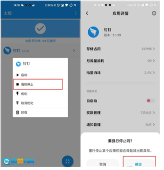 然后在Xposed框架界面里长按钉钉,选择强制停止。