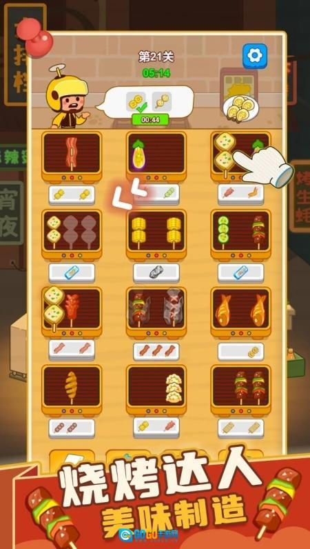 消除烤串:玩家需将三个相同的烤串凑到一起,就能达成消除。每关开启前会有引导提示,玩家要依据烤串的初始布局,拟定消除策略,合理安排移动的先后顺序。